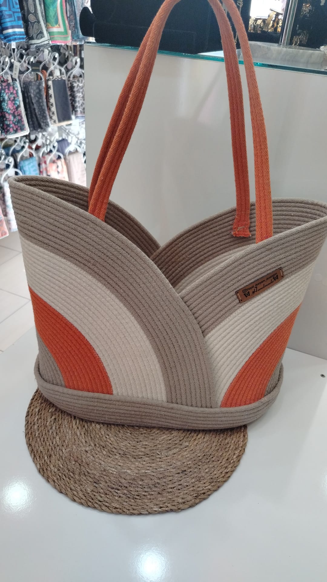 El emeği ile titizlikle üretilmiş bu benzersiz plaj çantası, makine dikişi tekniğinin zarafetini ve dayanıklılığını estetik bir tasarımla birleştiriyor. Doğal tonlardaki (bej, kırık beyaz, bej ve kahverengi) iplerin enerjik turuncu detaylarla birleşimi, çantaya dinamik ve göz alıcı bir karakter kazandırıyor. Geniş iç hacmi ve sağlam yapısıyla plaj günlerinizi veya günlük kullanımınızı konforlu hale getirecek bu çanta, stilinize otantik ve şık bir dokunuş katacak.