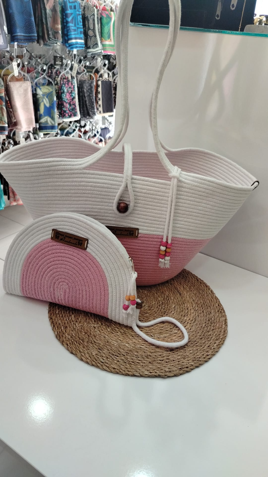 Zarif ve ferah bir tasarıma sahip bu el yapımı ip çanta ve cüzdan seti, el emeğinin sıcaklığını ve modern şıklığı bir araya getiriyor. Beyaz ve pembe renklerinin uyumu, taze ve canlı bir görünüm sunarken, ahşap detaylar ve boncuk süslemeler çantaya otantik bir hava katıyor. Geniş iç hacimli tote çanta, plaj günleri, alışveriş veya günlük kullanım için idealdir. Eşleşen yarım ay şeklindeki cüzdanı ise küçük eşyalarınızı düzenli tutmak için pratik bir çözüm sunar. Bu set, hem stilinize zarif bir dokunuş yapacak hem de el yapımı ürünlerin özgünlüğünü yaşam alanınıza taşıyacaktır.
